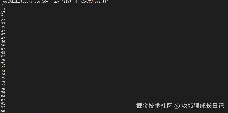 $1~/7/:这个条件使用正则表达式检查数字中是否包含字符“7”。如果是,条件为真。