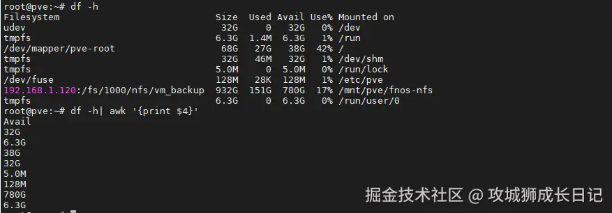 root@pve:~# df -h / | tail -1 | awk '{print $4}'