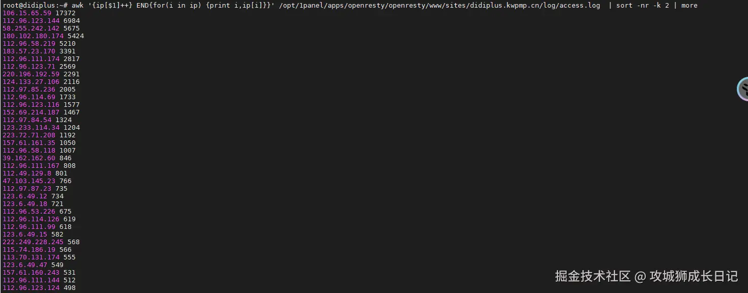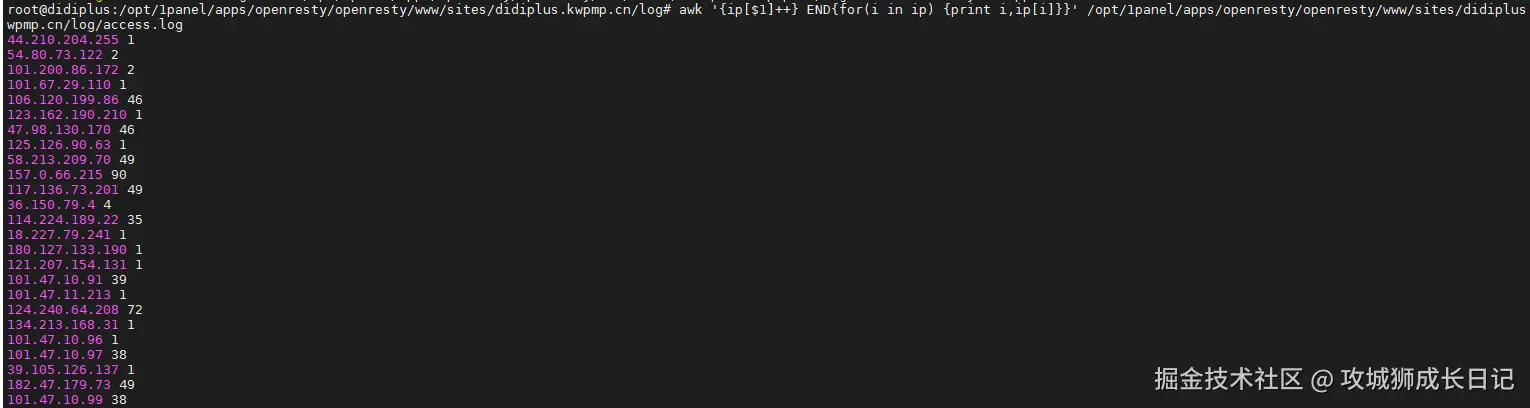 为此,可以使用awk创建一个关联数组,以IP地址为键值。每当遇到相同的IP地址时,对应的计数器加一,从而计算出每个IP地址的总出现次数。