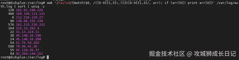 根据/var/log/auth.log日志文件,通过正则方式进行过滤远程连接密码失败的IP地址,并统计,执行如下命令: