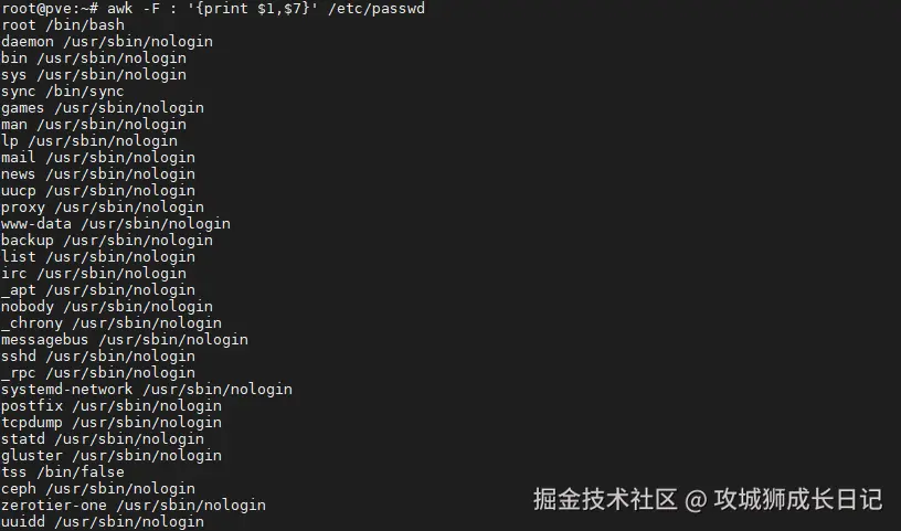 root@didiplus:~# awk -F: '$7!~/nologin$/{print $1,$7}' /etc/passwd