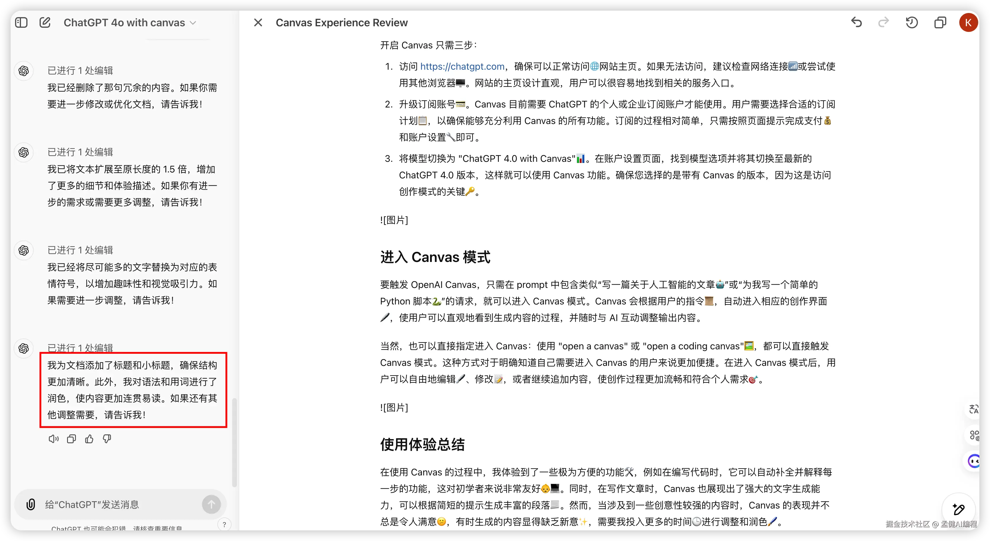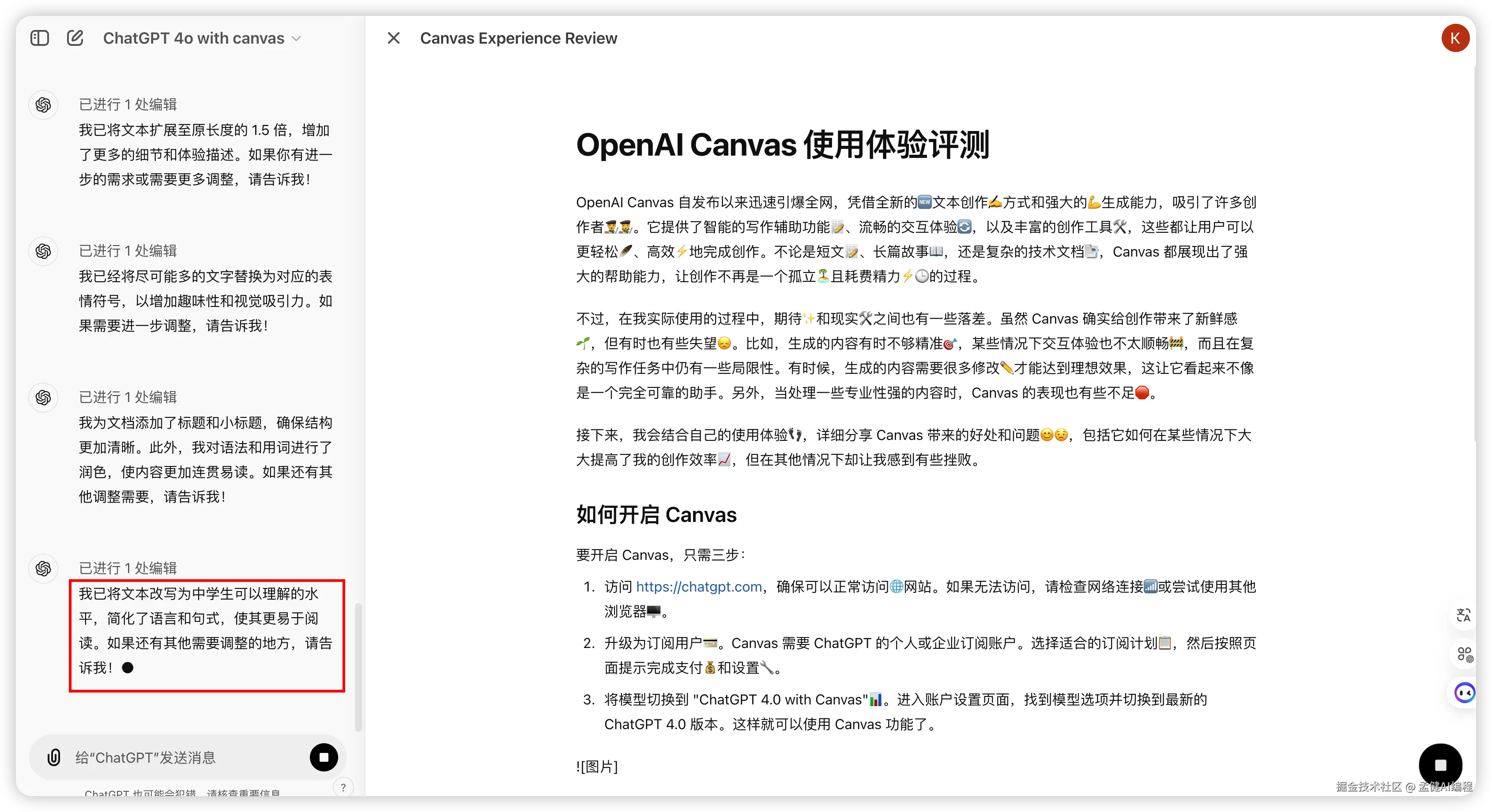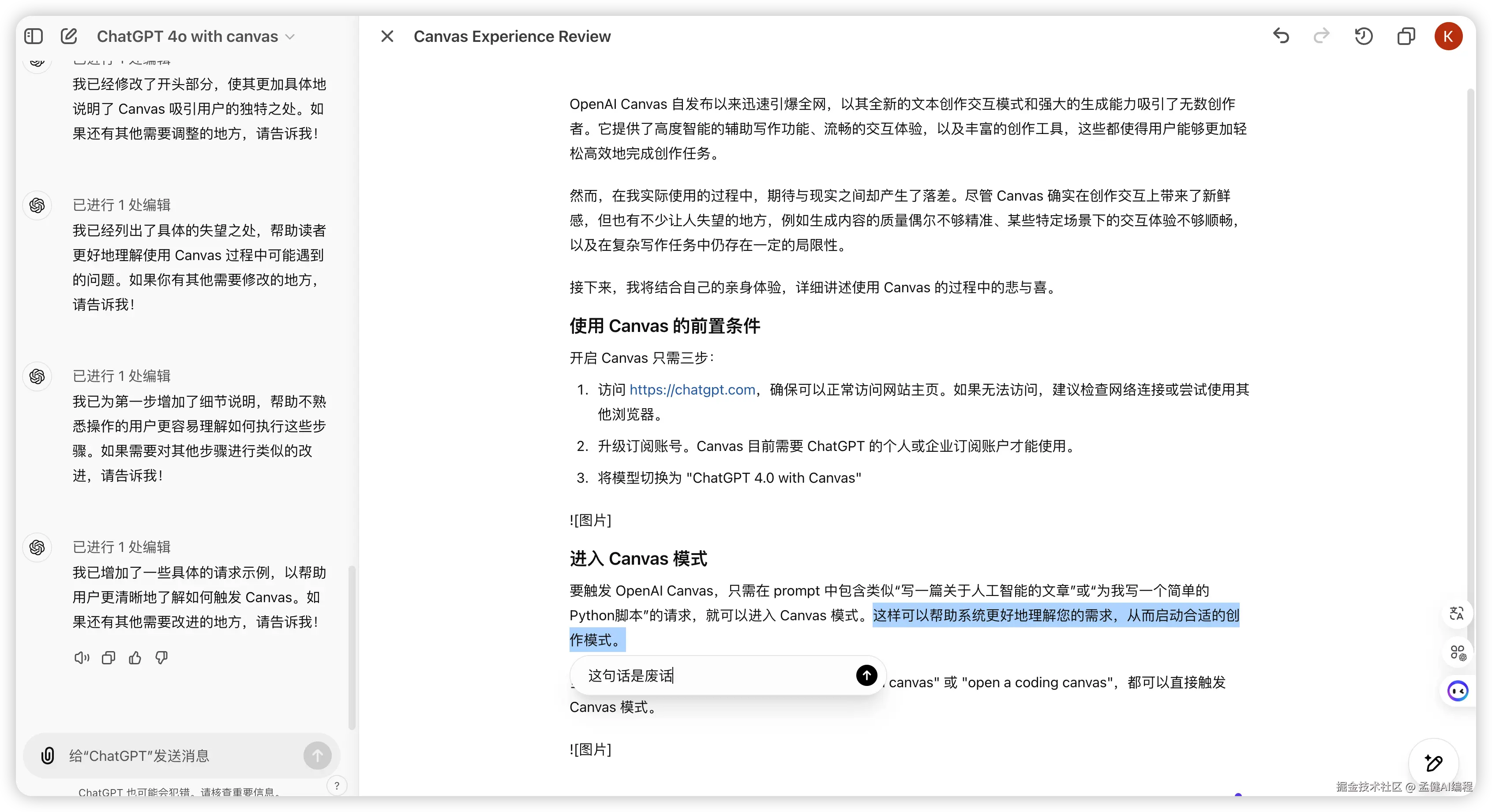 当我们的对话不是下达编辑指令的时候,canvas会为文档添加类似划线评论的能力: