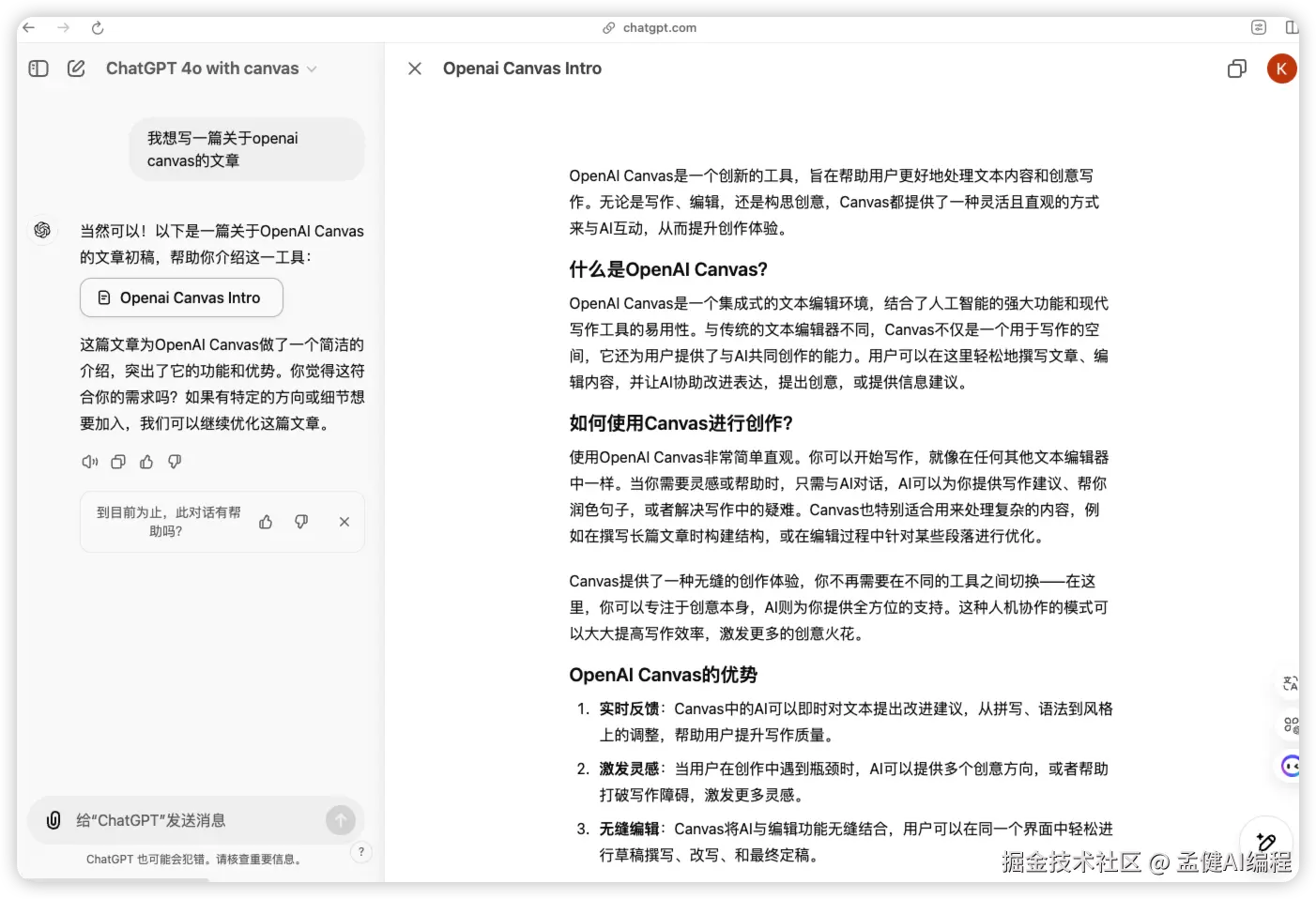 要触发OpenAI Canvas,对应的prompt只要包含类似写文章、写代码就可以进入Canvas模式。