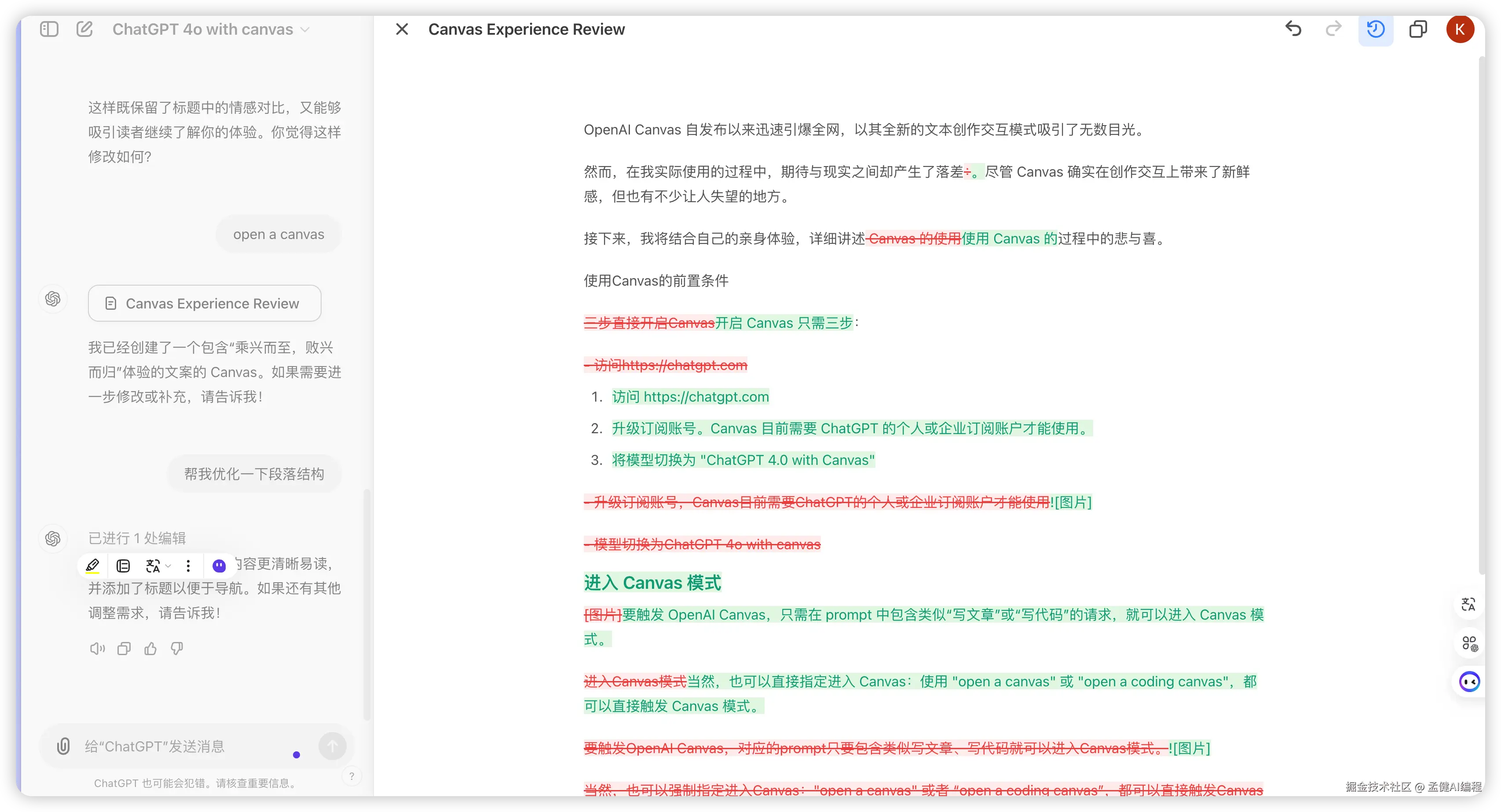 与 Notion 相比,我更喜欢 Canvas 提供的一边进行 AI 对话,一边编辑文案的模式。而且,Canvas 设计简洁,没有繁琐的确认流程,减少了用户的心智负担。通过不断的对话来改善文章,这是一种非常流畅的交互体验。AI 时代的文本创作工具不应将体验局限于弹框或狭小的空间中,这才是符合时代发展的创作工具的交互方式!