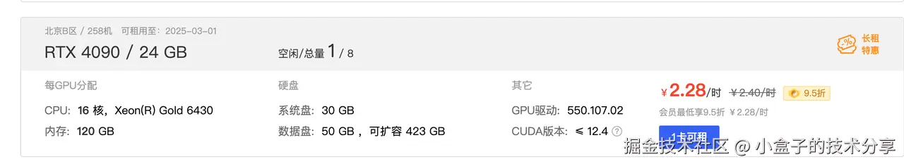 我们以 Autodl 算力租赁平台为例,一张消费级的 RTX 4090 显卡每小时的租用费用为 2.28 ¥