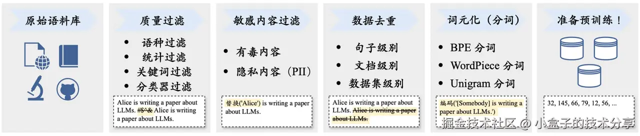 - 典型的预训练数据预处理流程如下图: