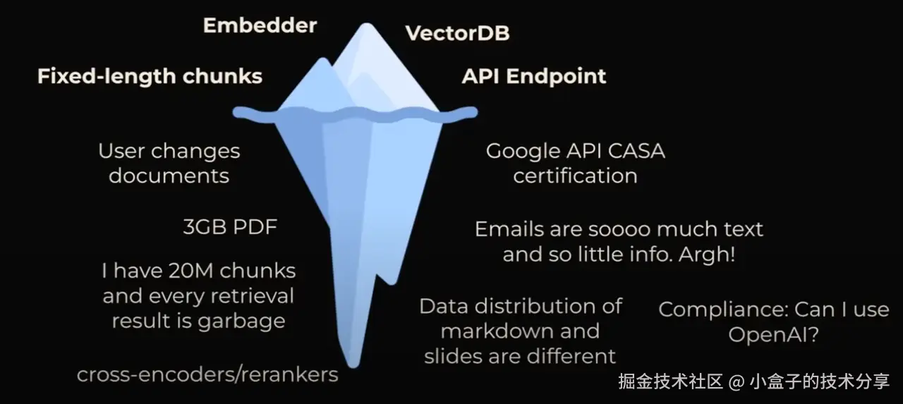 做一个 RAG 应用的原型设计很容易,但使其高性能、健壮且可扩展到大型知识语料库却很困难。比如如下图所示,在面对的问题不止冰山上面的,在冰山底下隐藏着更多难题: