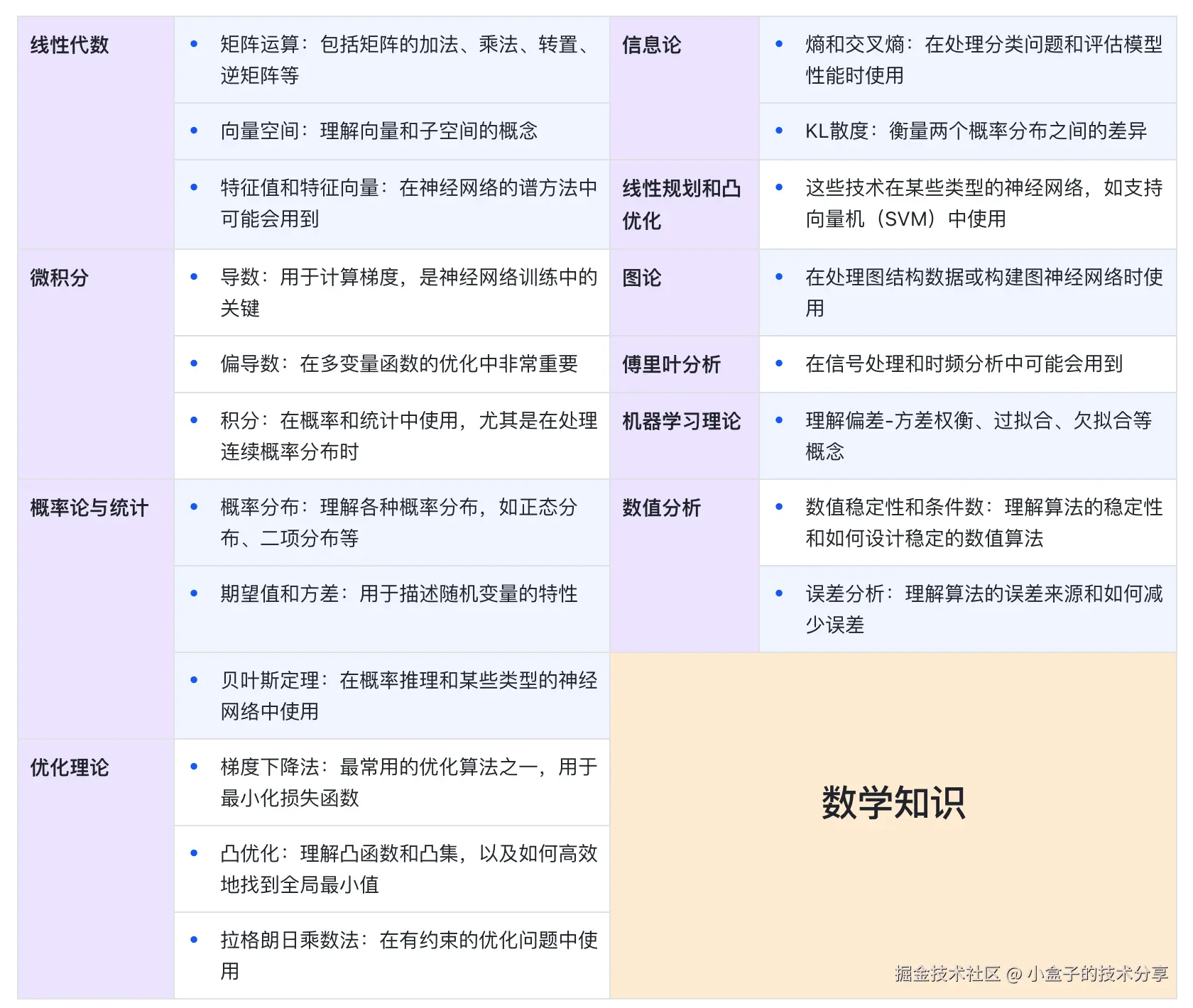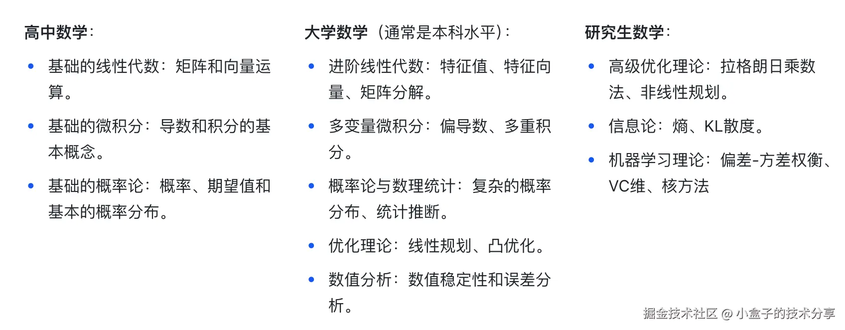 构建大型语言模型(LLM)所需的数学知识大多属于大学水平。以下是对这些知识的简要分类: