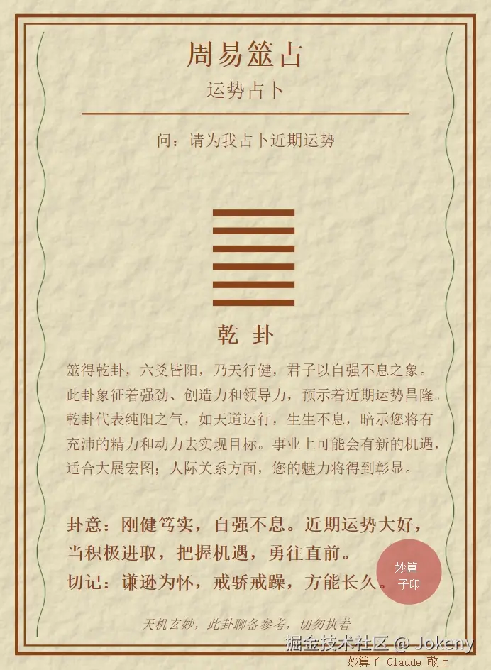 <text x="300" y="770" font-family="Noto Serif SC, STKaiti, serif" font-size="16" fill="#8A4419" text-anchor="middle" font-style="italic">天机玄妙,此卦聊备参考,切勿执着</text>