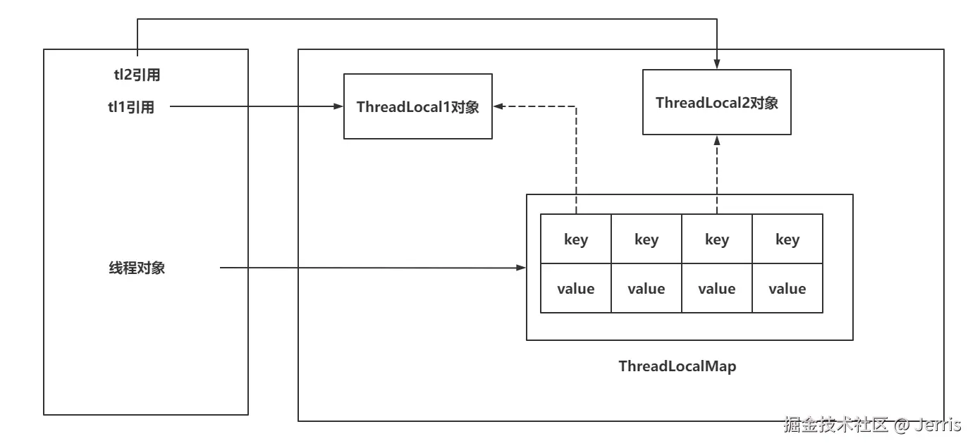 Thread中都存储着一个成员变量:ThreadLocalMap。 ThreadLocal本身不存储数据,像是一个工具类,基于ThreadLocal去操作ThreadLocalMap。ThreadLocalMap本身就是基于Entry[]实现的,因为一个线程可以绑定多个ThreadLocal,这样一来,可能需要存储多个数据,所以采用Entry[]的形式实现。- 每一个线程都有自己独立的
