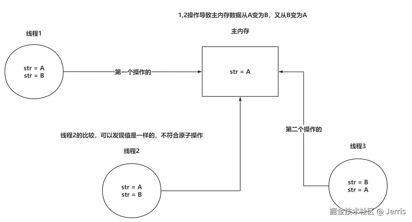 - ABA问题:问题如下,可以引入版本号的方式,来解决 ABA 的问题。Java 中提供了一个类在 CAS 时,针对各个版本追加版本号的操作: