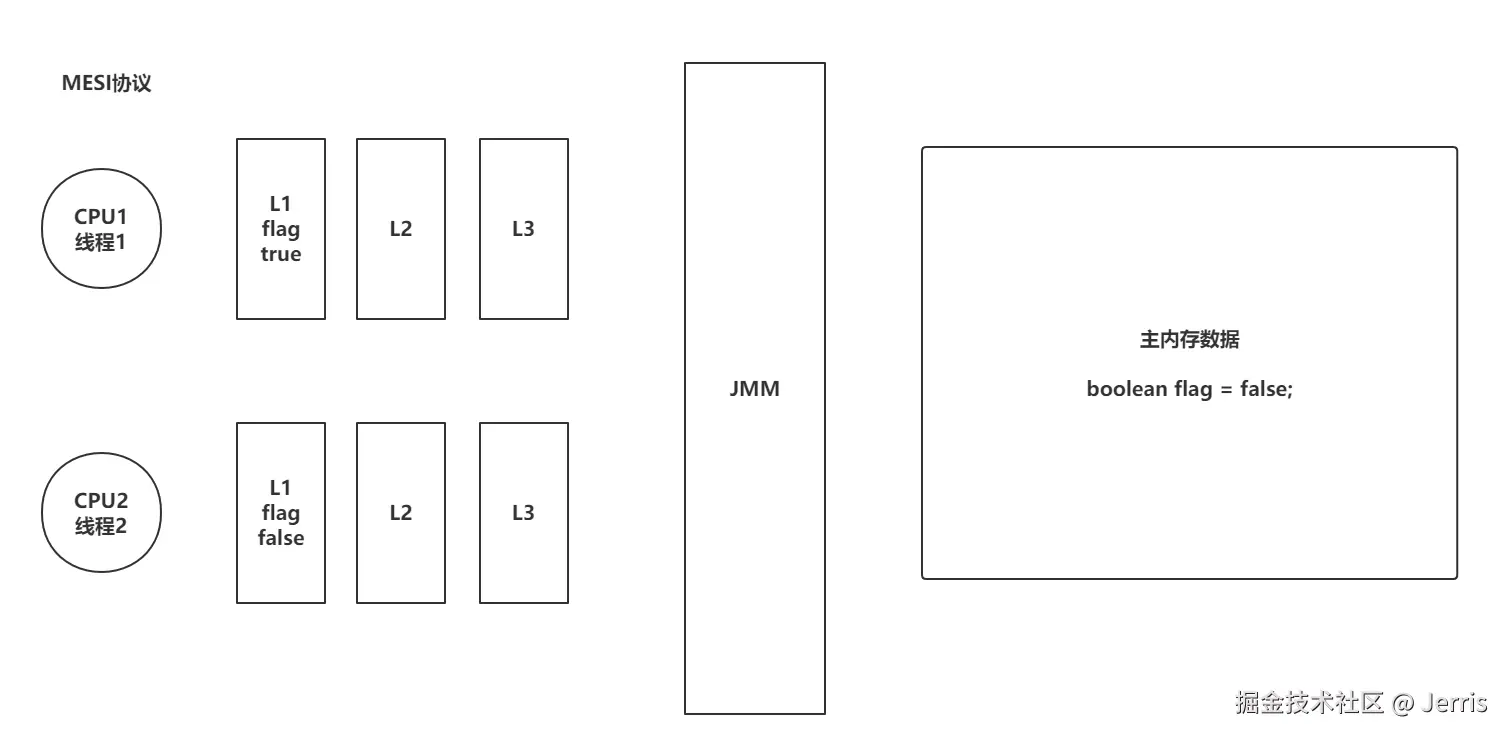 运行代码可以发现,在主线程中修改了 flag的值之后,子线程 t1 还是处在死循环中,因为子线程没有获取到主存最新的值,t1 获取到的是 CPU 缓存的值。