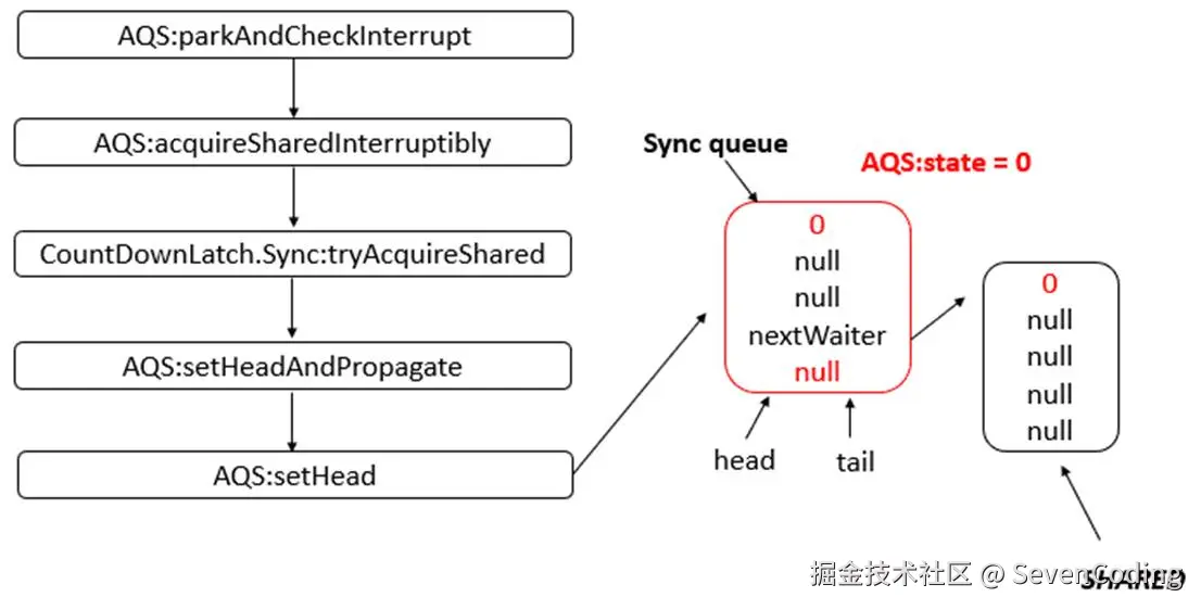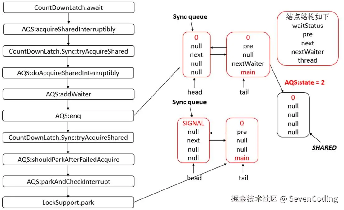 - main线程执行countDownLatch.await操作,主要调用的函数如下。