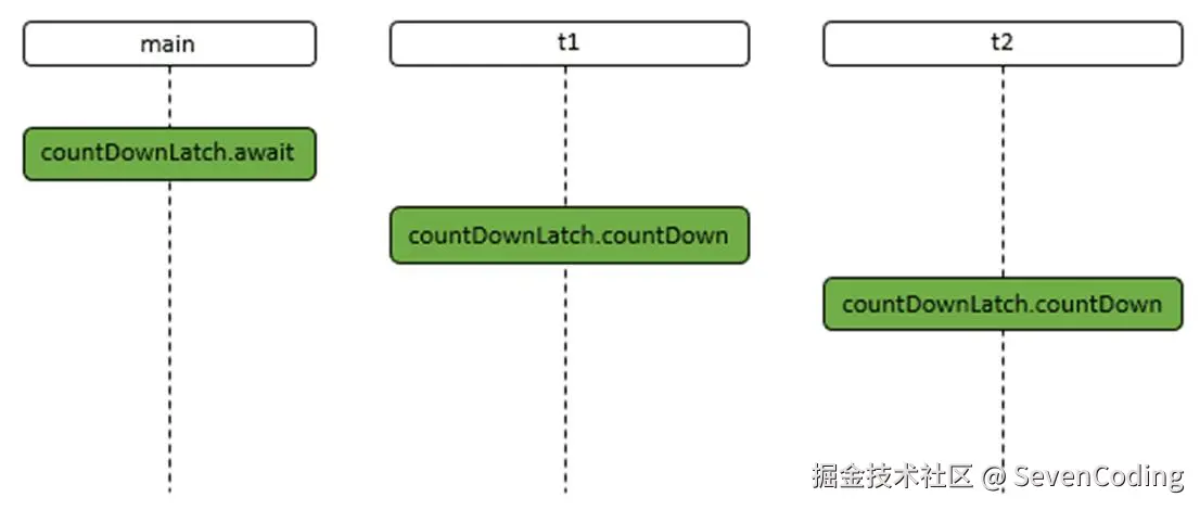 说明: 首先main线程会调用await操作,此时main线程会被阻塞,等待被唤醒,之后t1线程执行了countDown操作,最后,t2线程执行了countDown操作,此时main线程就被唤醒了,可以继续运行。下面,进行详细分析。