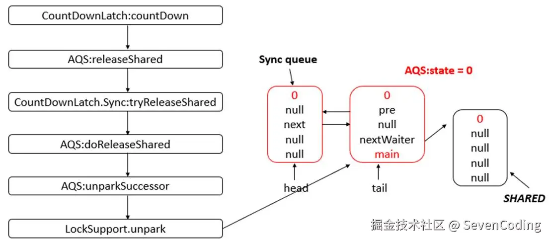 说明: 经过调用后,AQS的state为0,并且此时,main线程会被unpark,可以继续运行。当main线程获取cpu资源后,继续运行。