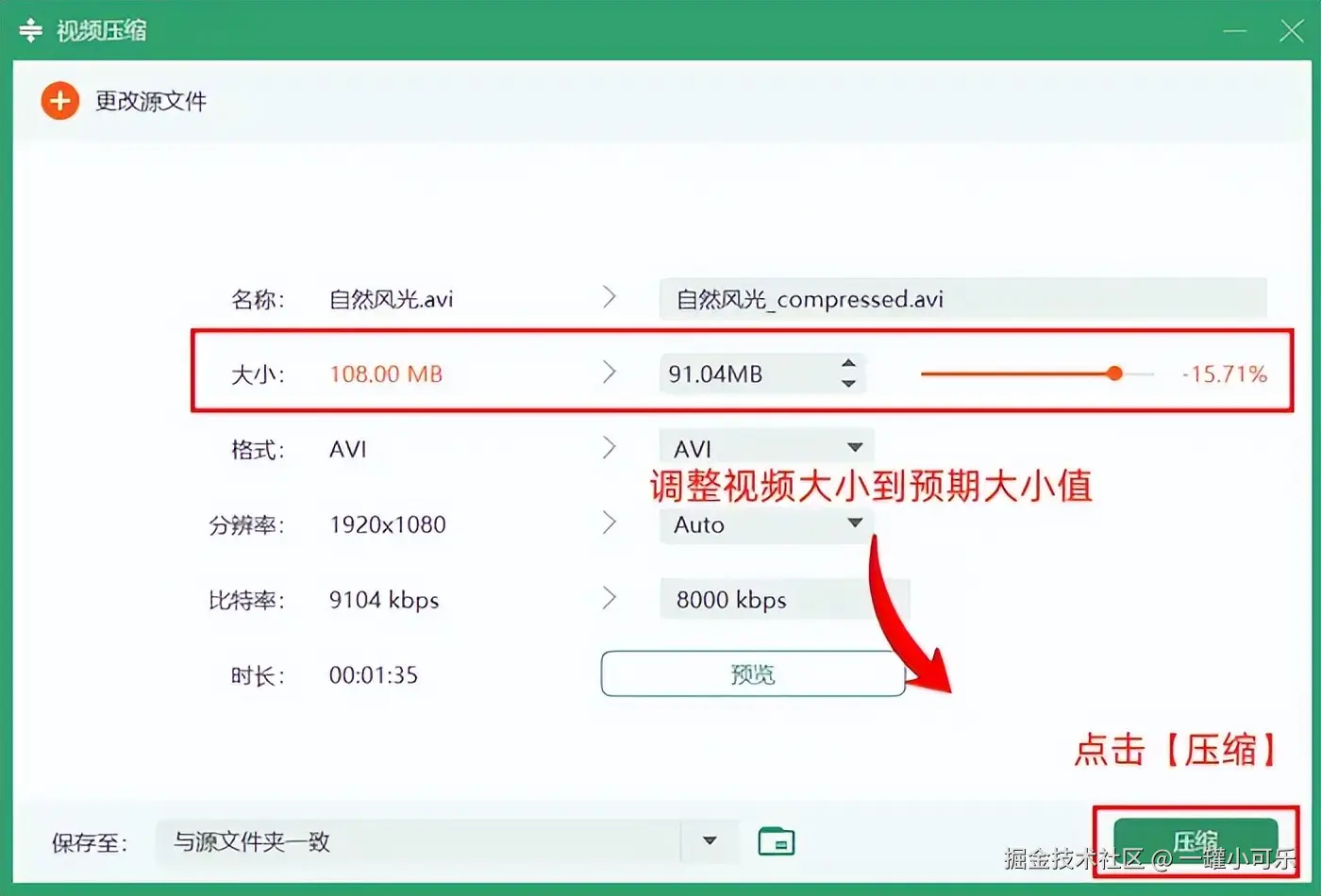 • 步骤3:在视频压缩参数调整界面,点击视频大小选项,调整视频大小到预期大小值,确定后点击【压缩】即可。