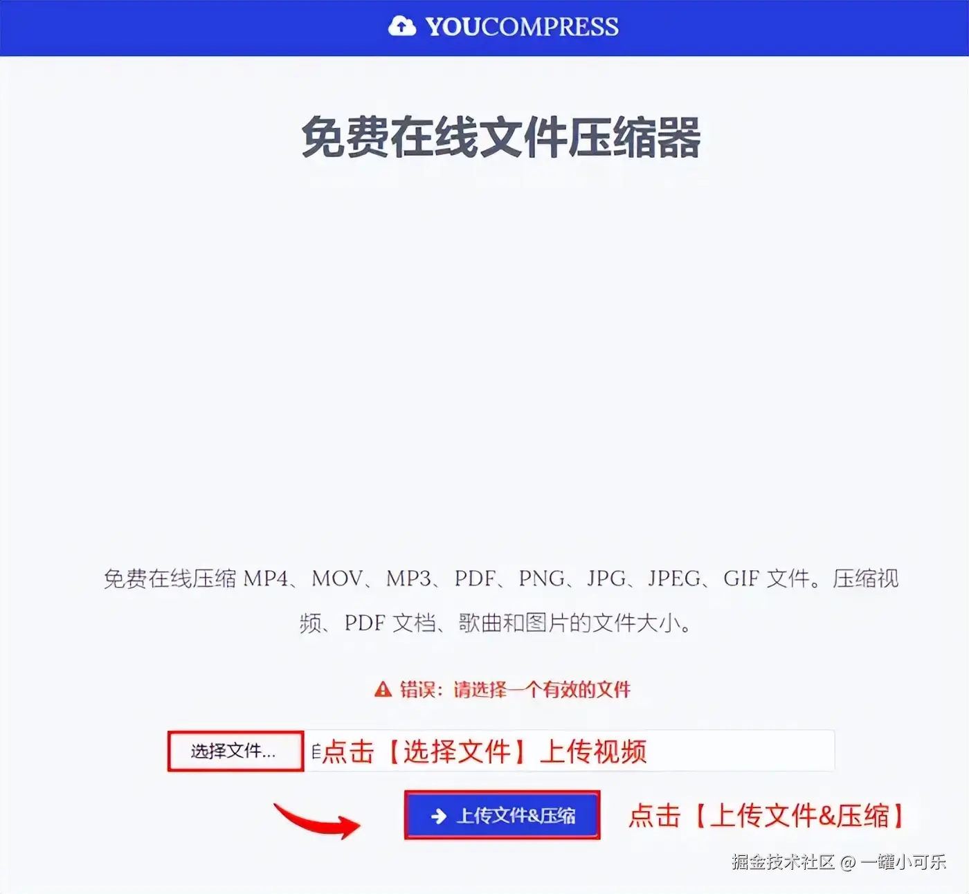 • 步骤1:在Youcompress页面,点击【选择文件】上传视频,然后点击【上传文件&压缩】按钮,即可压缩视频。