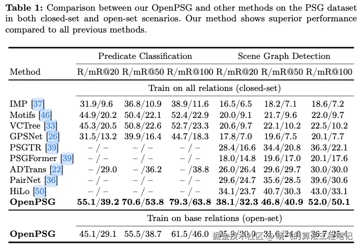 OpenPSG)。OpenPSG利用LMMs以自回归的方式实现开放集关系预测,引入了一个关系查询变换器,以高效地提取对象对的视觉特征,并估计它们之间关系的存在。后者可以通过过滤不相关的对来提高预测效率。最后,论文设计了生成和判断指令,以自回归的方式在PSG中执行开放集关系预测。大量实验表明,该方法在开放集关系预测和全景场景图生成方面取得了最先进的性能。来源:晓飞的算法工程笔记 公众号,转载请注明出处