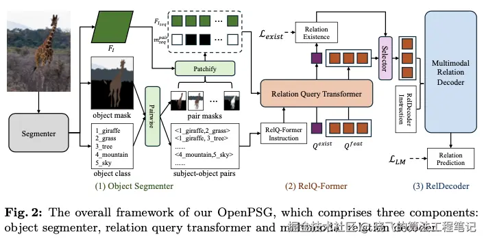 如图2所示,OpenPSG包含三个组件:对象分割器、关系查询变换器 (RelQ-Former) 和多模态关系解码器 (RelDecoder)。