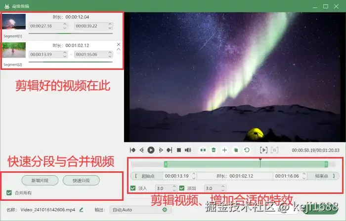 步骤3:录制出高清视频后,我们还能使用软件的【高级剪辑】功能对视频进行分段、合并、剪辑、增加特效等后期处理。
