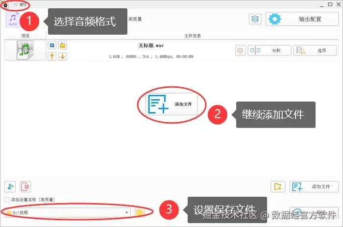 数据 蛙是一款优秀的音频格式转换器,用户可以使用它将视频文件转换为多种音频格式,它广泛地支持多种音频格式,包括MP3、WAV、AAC、FLAC等,还能确保输出的音频文件音质清晰。