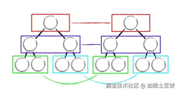 相同层级的节点对比如下图所示,比较的时候会一层一层的对相同颜色方框内的节点进行比较。当发现节点发生了变化时,只会处理该层的变化(比如将该节点及其子节点完全删除或重建),而不会去进一步的比较检查更深层的节点。这种策略大大减少了需要比较的节点数量,这是降低复杂度量级方面的一个最重要的设计,也是 React Diff 算法性能突破的关键点。