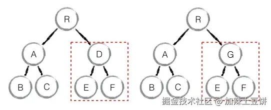 当 D 节点改为 G 节点时,整棵 D 子树会被删掉,G、E、F 节点会重新创建。