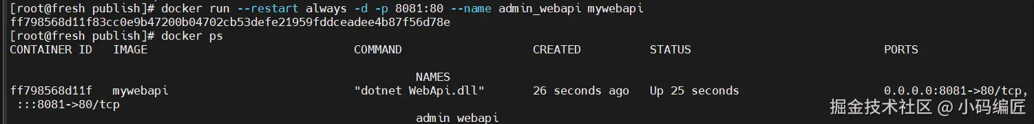- docker run-- restart always -d -p 8081:80- -name webapi webapi