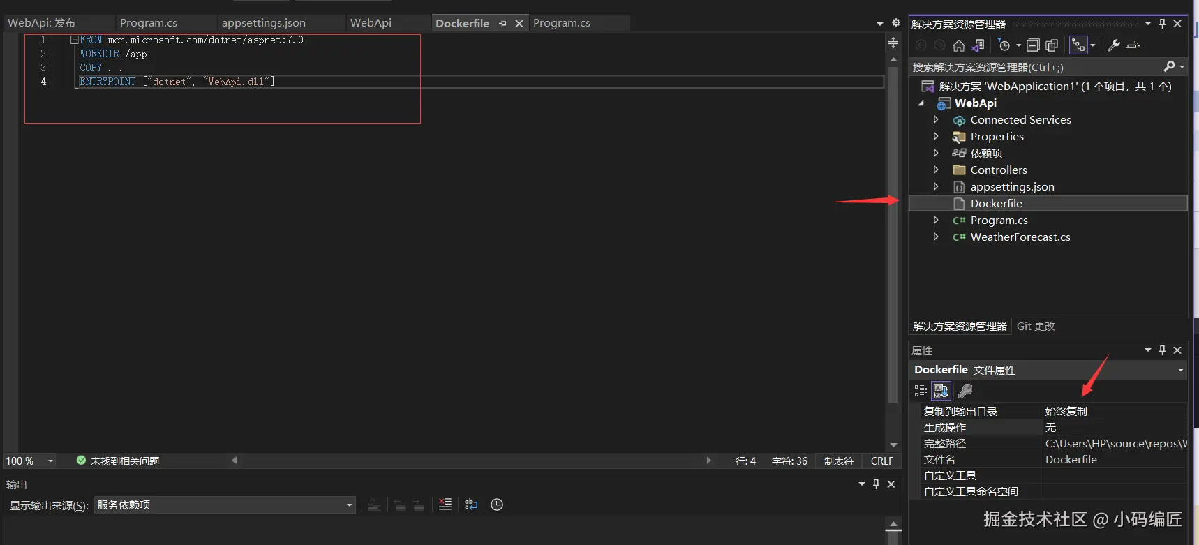 本地发布一下项目,然后把dockerfile放到发布后的目录里或则选择属性始终复制