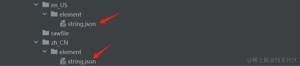 如下所示,如果希望在 系统语言 切换时,应用程序可以展示不同的字符串资源。只要在不同语言的文件夹中提供字符串映射即可,如果当前系统语言没有支持,会使用 base 中的资源。通过 $r('app.string.xxx') 访问对应的字符串: