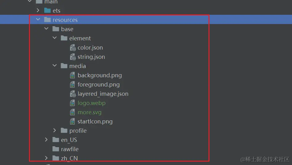 官方文档中对资源目录结构有详细的介绍,目前我们主要使用 base 的 media 文件夹中放置媒体数据,比如图片、音频;在 element 文件夹中放置字符串、颜色等常量资源。