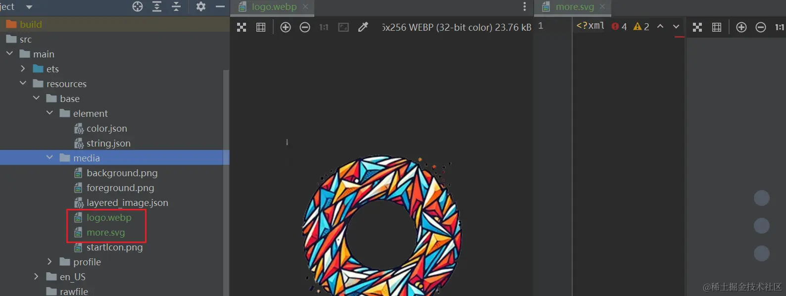 ArkUI 中通过 Image 组件展示图片,它可以支持常规的图片格式,比如 png、jpg、webp、gif 等,也可以直接支持 svg 的图像资源:。如下所示,将 logo.webp 和 more.svg 放到 media 文件夹下: