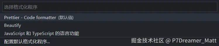 选择“配置默认格式化程序”,再选择“Prettier”。