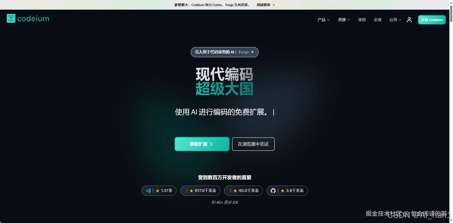 核心优势:Codeium基于尖端AI技术,提供代码补全和方法级代码生成,支持40多种编程语言。