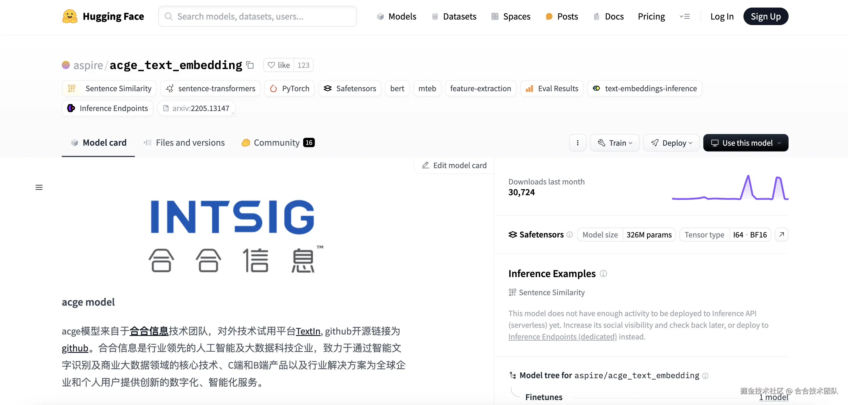 在Hugging Face平台上,acge模型单月下载量为30,423。
