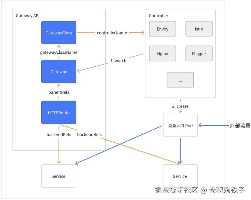 GatewayClass 与控制器 Controller 使用 spec.controllerName 关联。