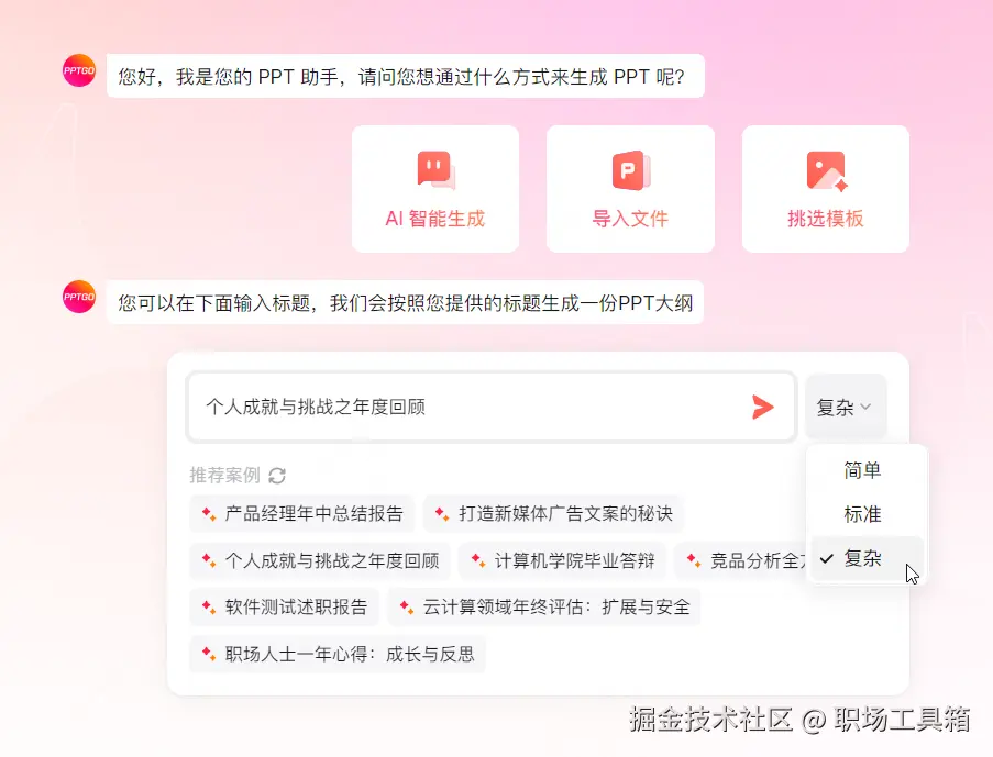 如果你选择从头开始,可以使用博思AIPPT的AI智能生成功能。只需输入你的PPT主题或导入Word/PDF/Markdown/TXT文档,AI就能自动为你生成完整的PPT内容和结构。