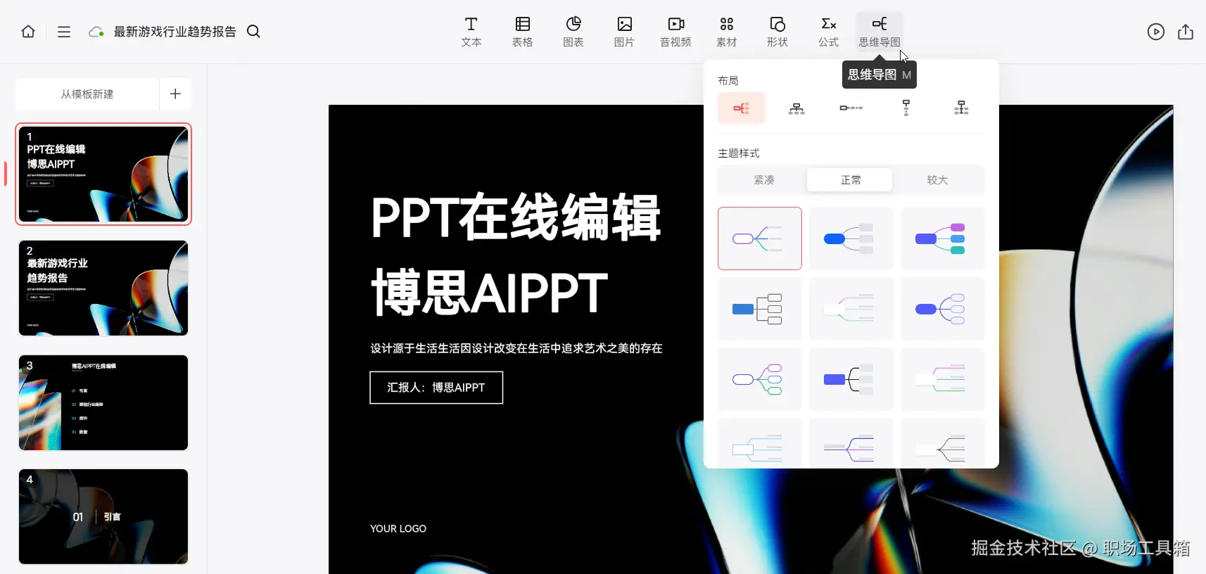 进入博思AIPPT的编辑界面,顶部的工具栏提供了添加各种元素的选项,诸如文本、表格、图表、图片、音频和视频、形状、公式和思维导图,点击后在页面上添加对应的元素。