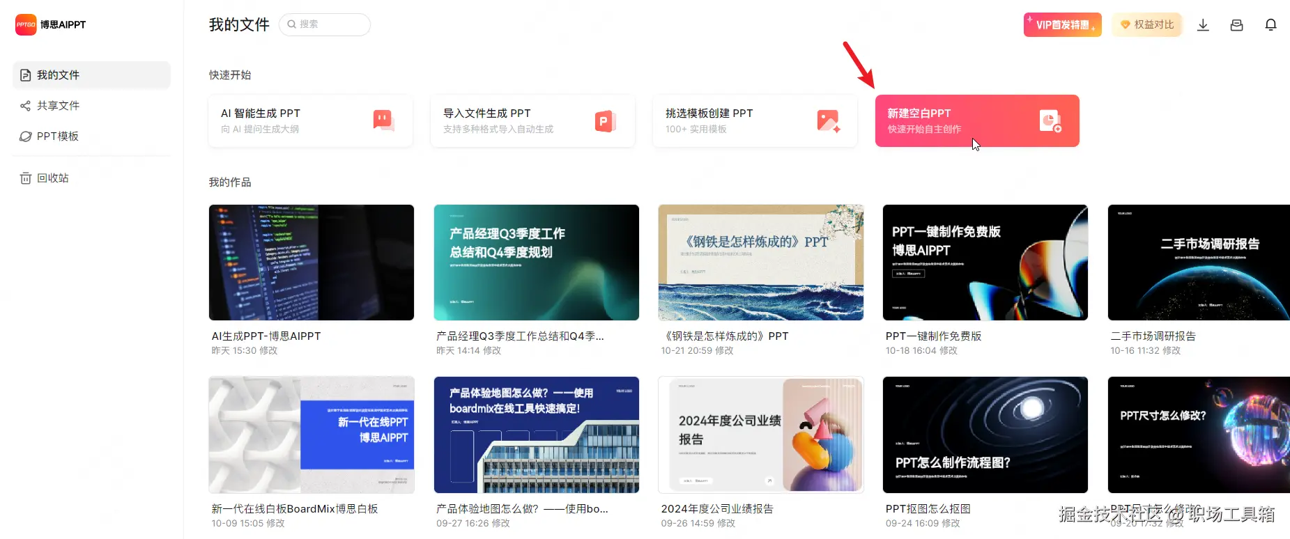 下图是博思AIPPT的首页,点击“新建空白PPT”,创建一个空白的演示文稿。