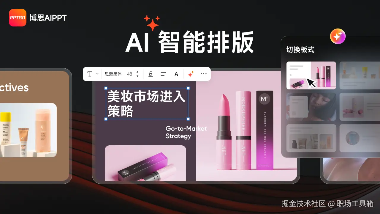 博思AIPPT的智能排版功能可以自动调整你的内容布局,确保每一页PPT都美观协调。你只需点击智能排版按钮,AI就会为你优化整个PPT的排版。