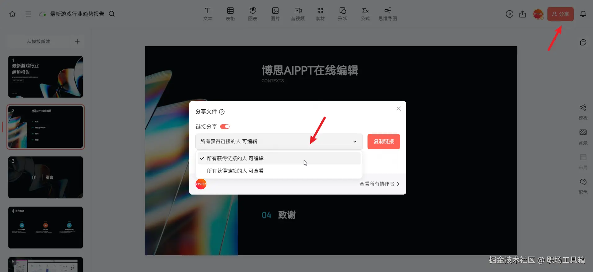 如果是团队项目,你可以分享文件链接,邀请同事一起协作编辑。博思AIPPT支持多人实时协作,你可以看到同事们的实时编辑,并进行即时沟通和讨论。