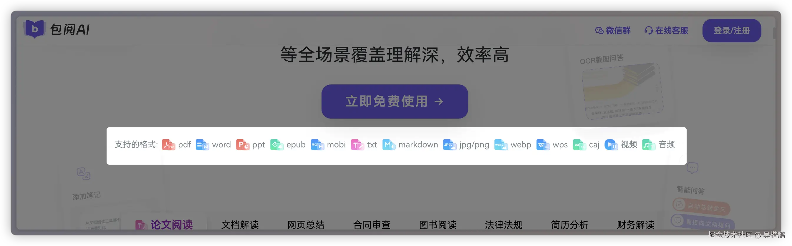 除了 PDF 文档,还支持 word、ppt、epub、mobi、txt、markdown、jpg/png、webp、wps、caj,甚至还有视频、音频。