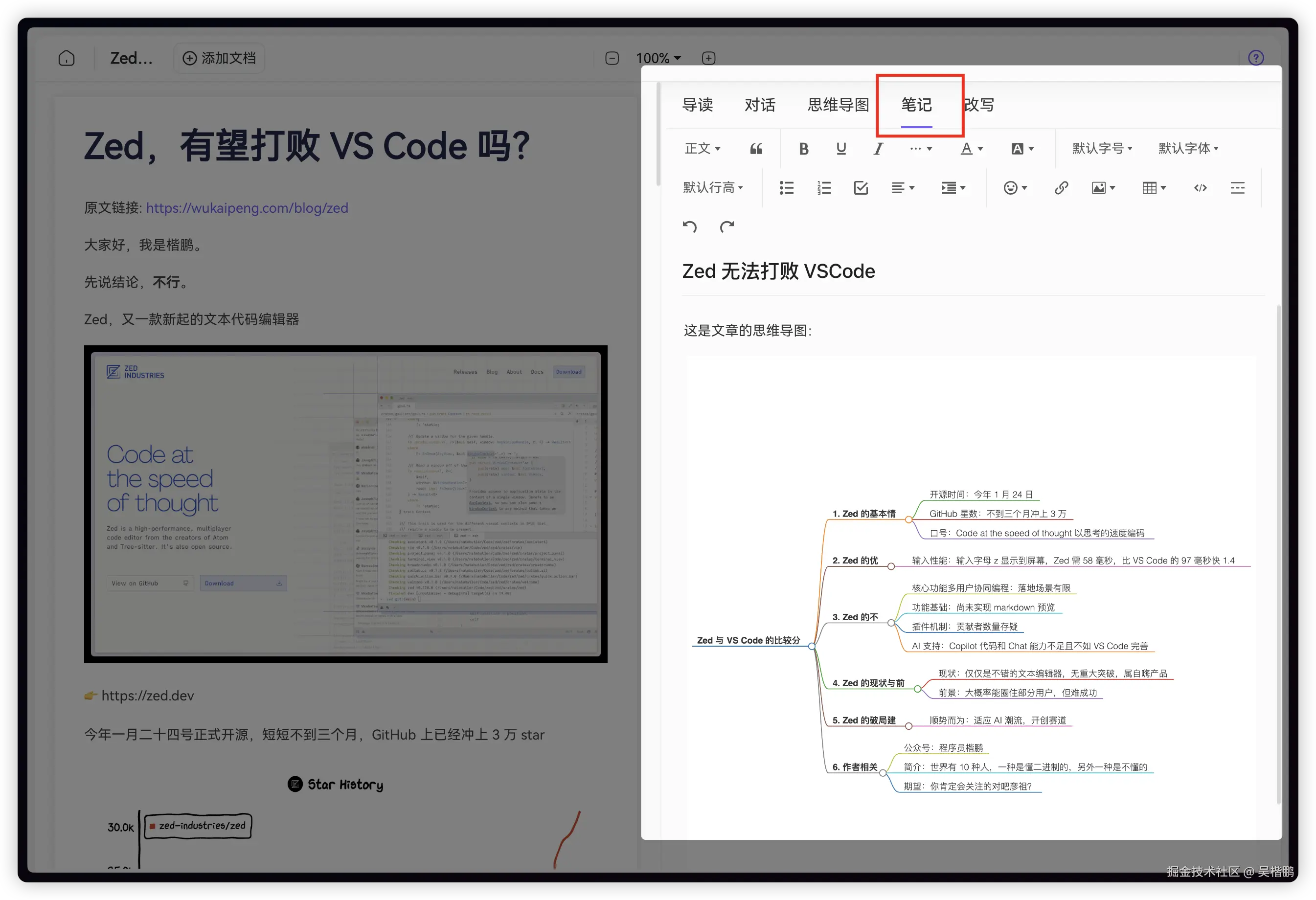 比如用「自媒体 > 科技新闻精读」场景中,让包阅解读这篇 《Zed,有望打败 VS Code 吗?》