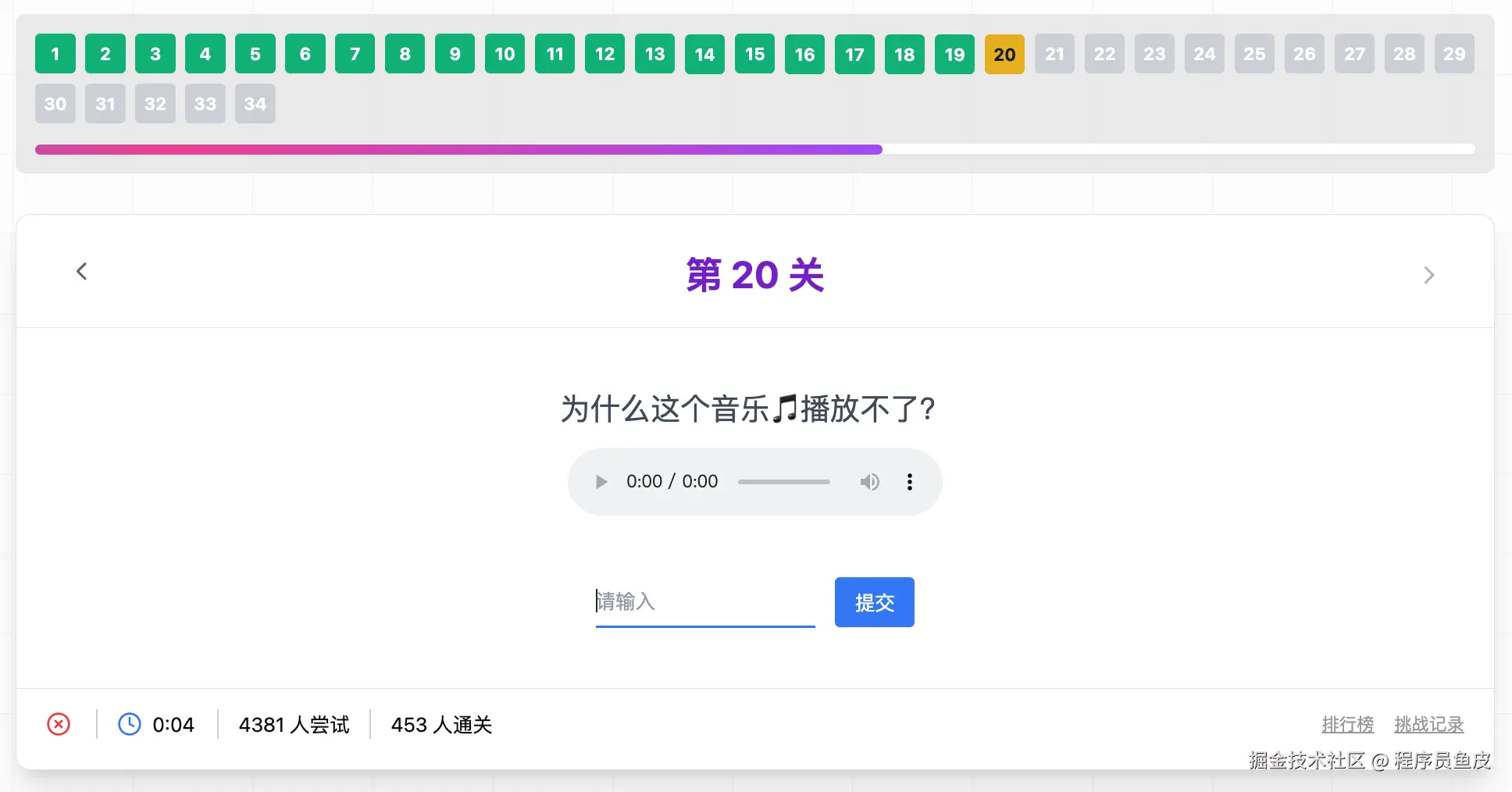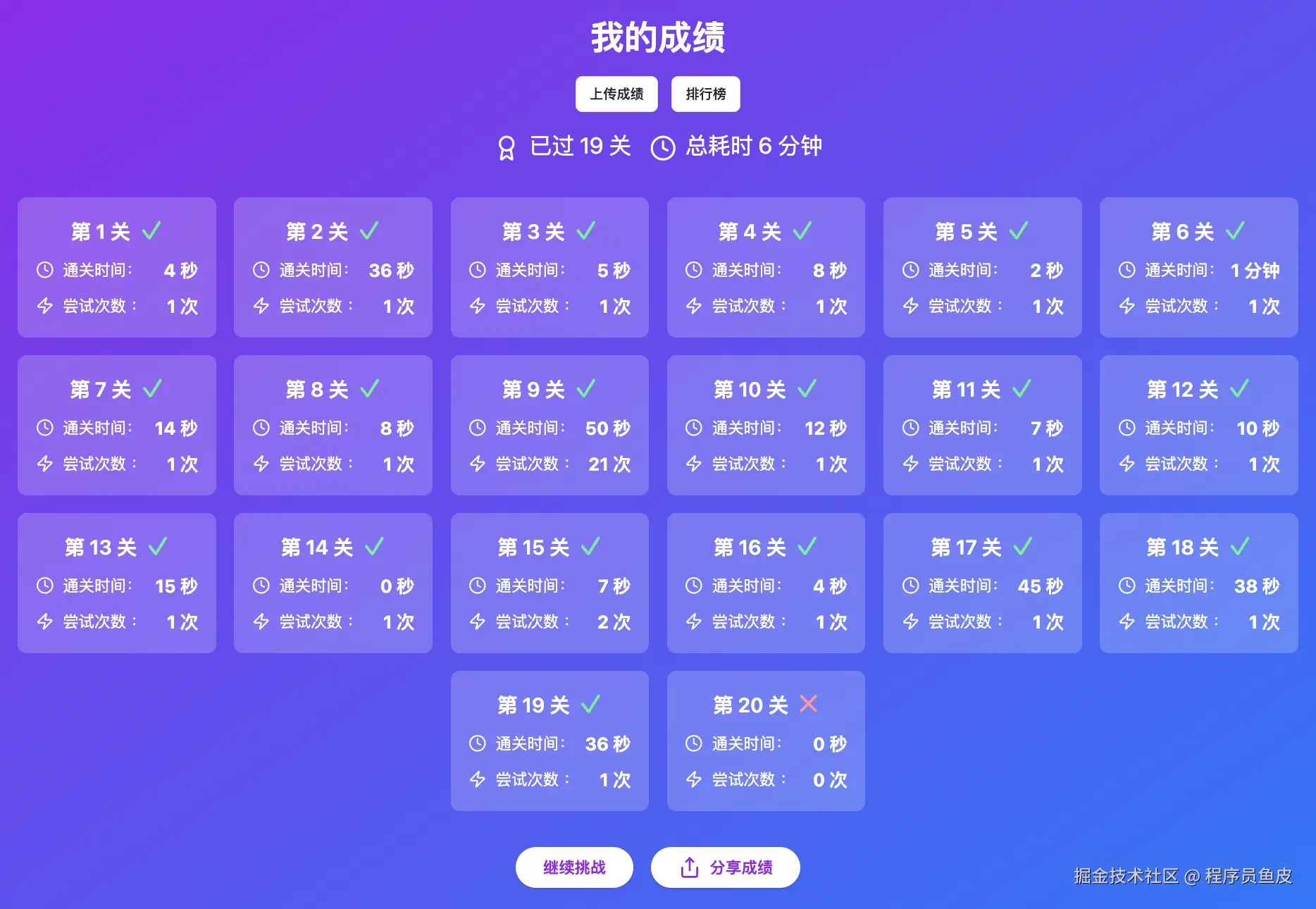 大家可以查看自己的过关记录,上传成绩,并且查看到自己的排名。咳咳,我保守估计只有不到 1% 的同学能通关。