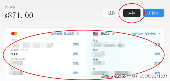 然后在“我的卡片”里获取卡的付款信息(一定要保管好),同时充值也在这个界面右上角