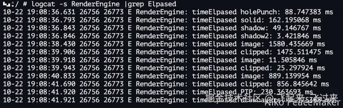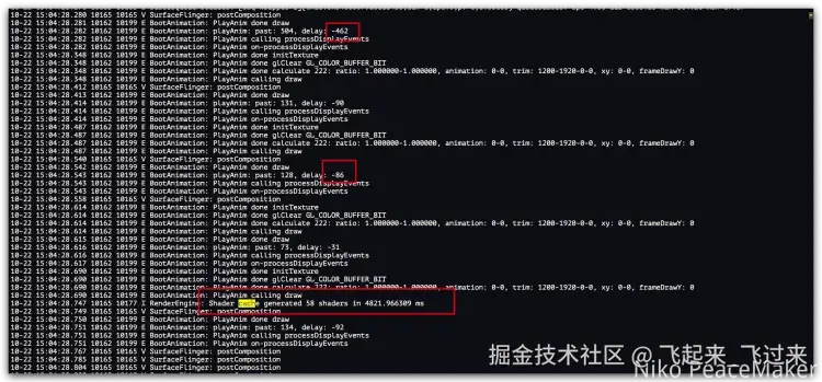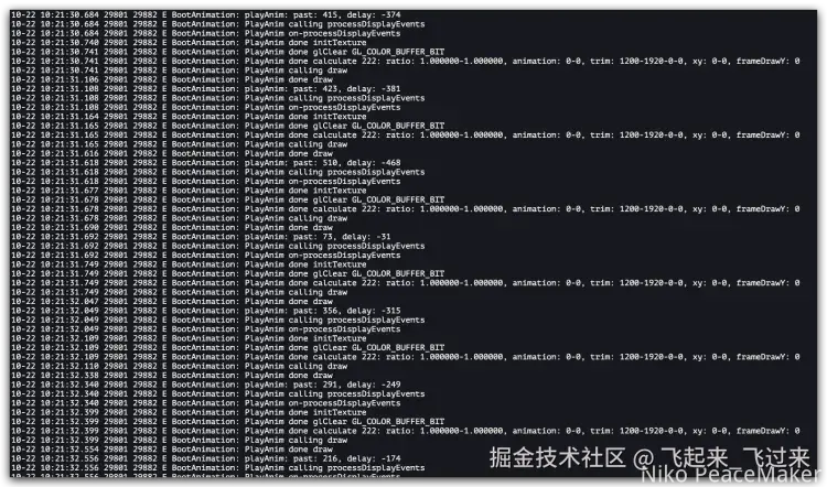 我们主要在收到屏幕刷新事件(processDisplayEvents)、完成一帧开机动画的buffer分配和解码(initTexture和glClear)、上传至GPU并触发绘制(calling draw、done draw)这几个核心流程打印日志。并且在一帧数据绘制完成后把该帧总耗时和相对于不卡顿情况下耗时慢了多少毫秒打印出来(past和delay)。日志结果如下。