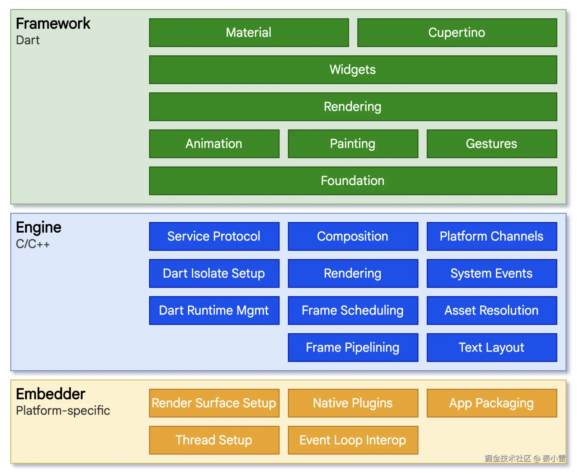 这个架构中,最底下的Embedder层便是兼容层,屏蔽掉不同平台的差异性,在Android平台使用java开发,在iOS使用OC开发。上面的Engine层和Framework层使用c++、dart开发,为平台无关的语言。Engine层实现各种布局、渲染逻辑,为了开发方便,还内置了一个Dart语言的虚拟机,这样,我们便可以将大部分逻辑使用Dart快速开发,Flutter自己的Framework,包括各种Widget、动画、手势便是使用Dart开发。