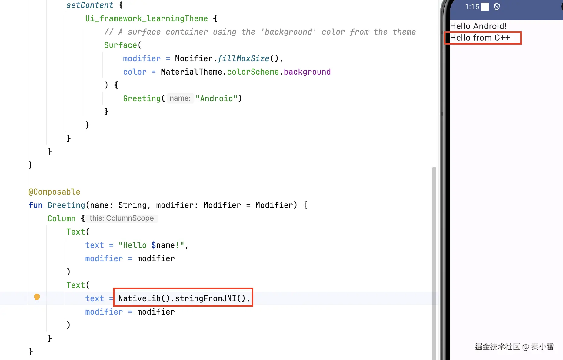 在app模块的build.gradle中,我们设置好依赖原生模块implementation(project(":nativelib")),便可以在app模块的java代码中调用NativeLib.stringFromJNI()。这样,点击运行,Android Studio会自动编译我们的native模块,我们在app模块中通过调用原生模块的java native方法,从而调用到了c++代码。
