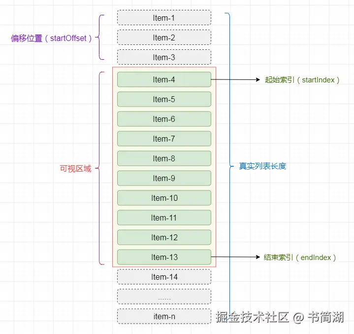 仅加载可视区域内的列表项,当发生滚动时计算应展示列表项的startIndex,endIndex,并计算对应的数据在整个列表中的偏移量(为了让列表项展示在可视区域内)