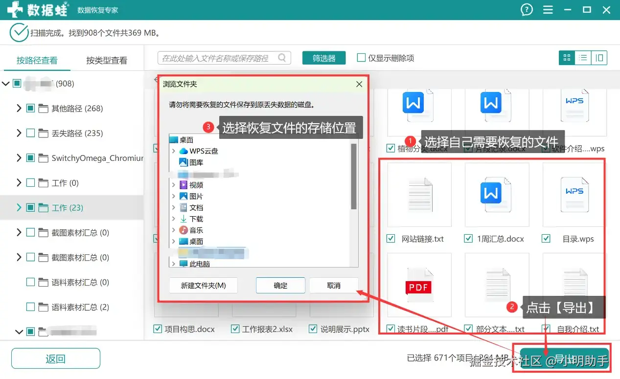 第2步:完成扫描后,在右侧勾选上自己需要恢复的文件,然后点【导出】, 最后在弹窗选择文件的存放位置;